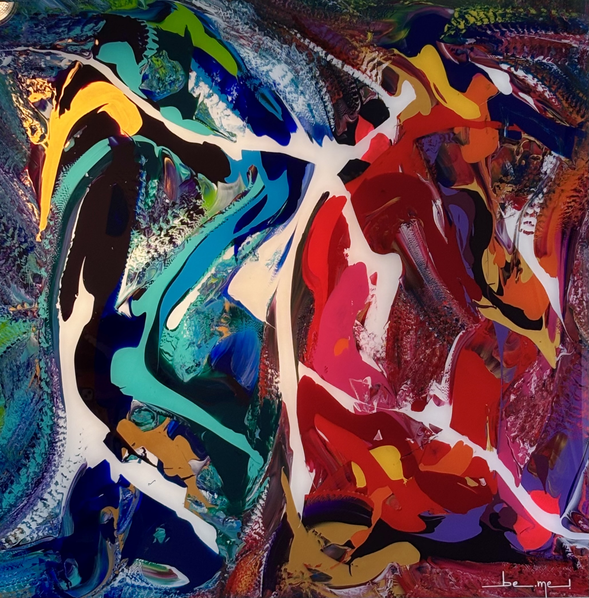 (Dit schilderij is gedeeltelijk gemaakt met ‘glow in the dark’-verf. De tekst worden tijdelijk zichtbaar in het donker, nadat deze licht heeft opgenomen.)